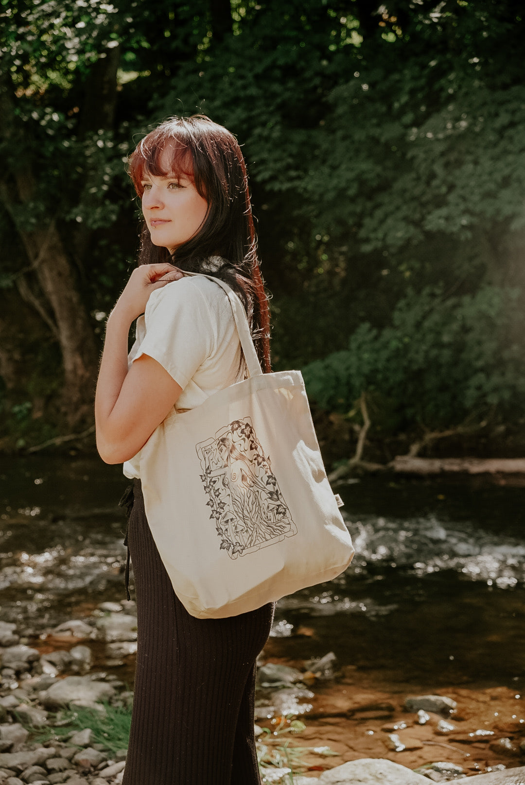 Nachhaltige Tote Bag aus 100 % Bio-Baumwolle mit der Aufschrift Rooted in Nature. Teil der Nature Feminism Collection.